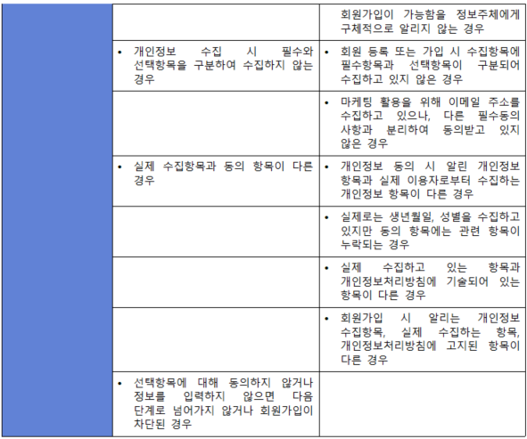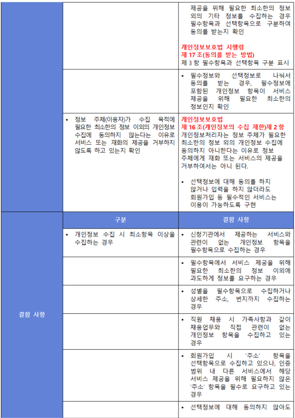 (내용) 개인정보는 서비스 제공을 위하여 필요한 최소한의 정보를 적법하고 정당하게 수집하여야 하며, 필수정보 이외의 개인정보를 수집하는 경우에는 선택항목으로 구분하여 해당 정보를 제공하지 않는다는 이유로 서비스 제공을 거부하지 않아야 한다.