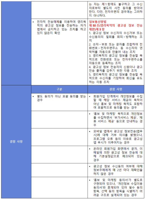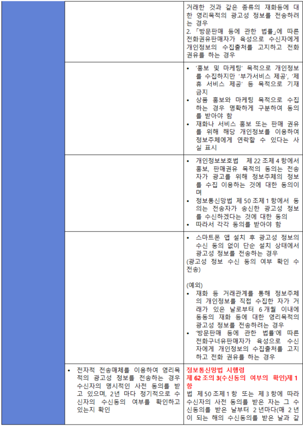 (내용) 재화나 서비스의 홍보, 판매 권유, 광고성 정보전송 등 마케팅 목적으로 개인정보를 수집·이용하는 경우에는 그 목적을 정보주체(이용자)가 명확하게 인지할 수 있도록 고지하고 동의를 받아야 한다.