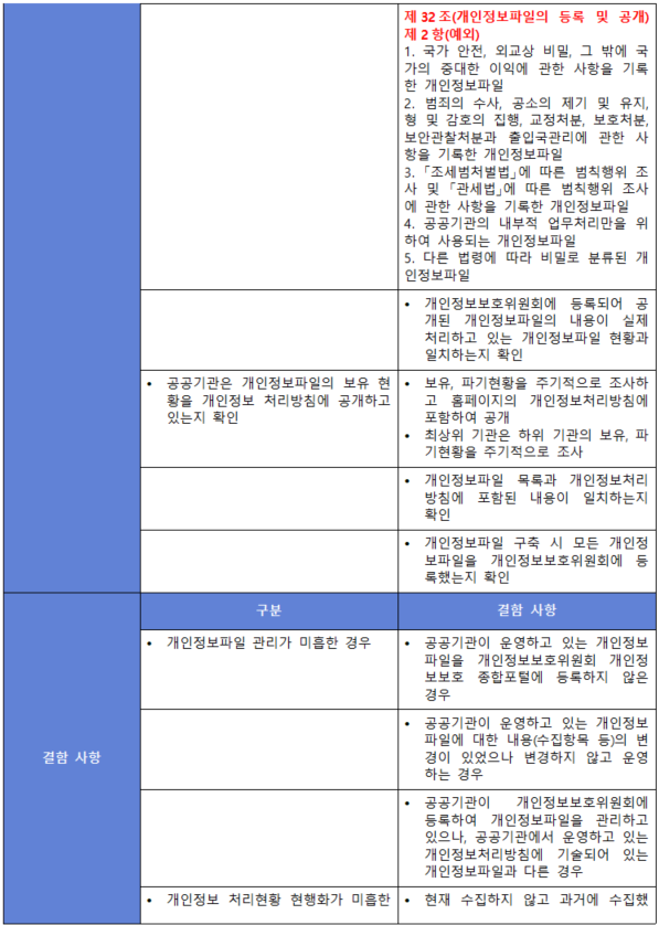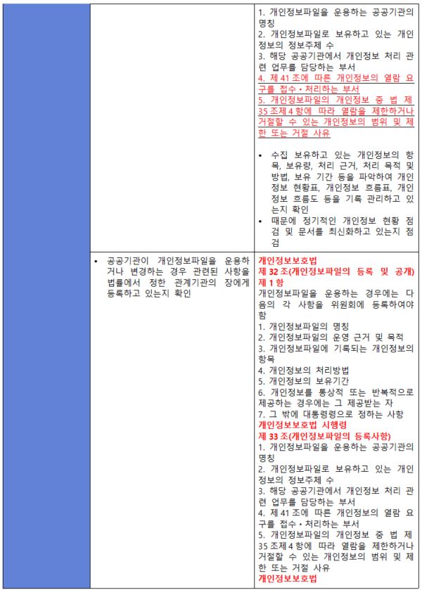 (내용) 수집·보유하는 개인정보의 항목, 보유량, 처리 목적 및 방법, 보유기간 등 현황을 정기적으로 관리하여야 하며, 공공기관의 경우 이를 법률에서 정한 관계기관의 장에게 등록하여야 한다.