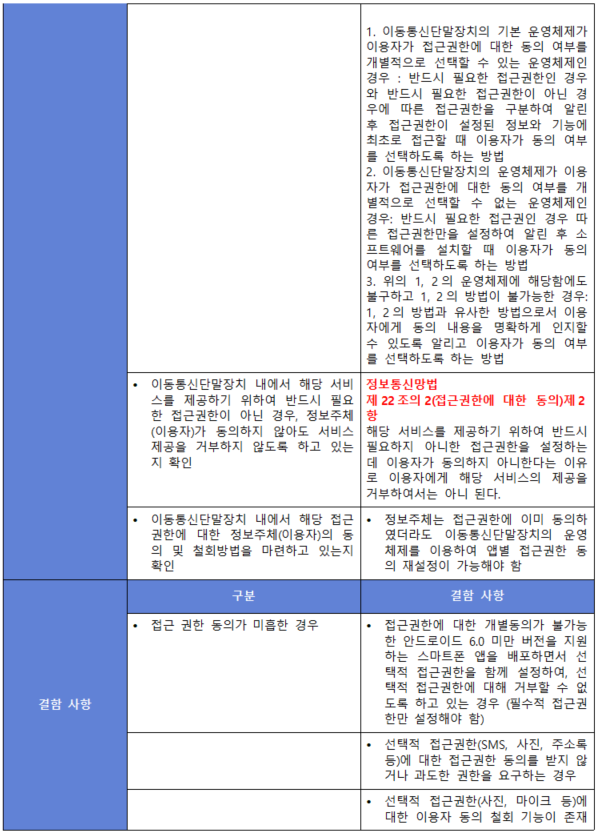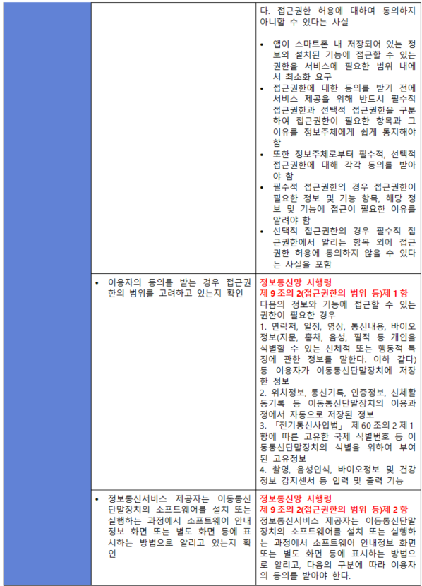 (내용) 정보주체(이용자)의 이동통신단말장치 내에 저장되어 있는 정보 및 이동통신단말장치에 설치된 기능에 접근이 필요한 경우 이를 명확하게 인지할 수 있도록 알리고 정보주체(이용자)의 동의를 받아야 한다.