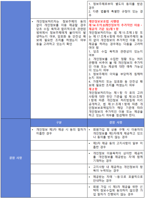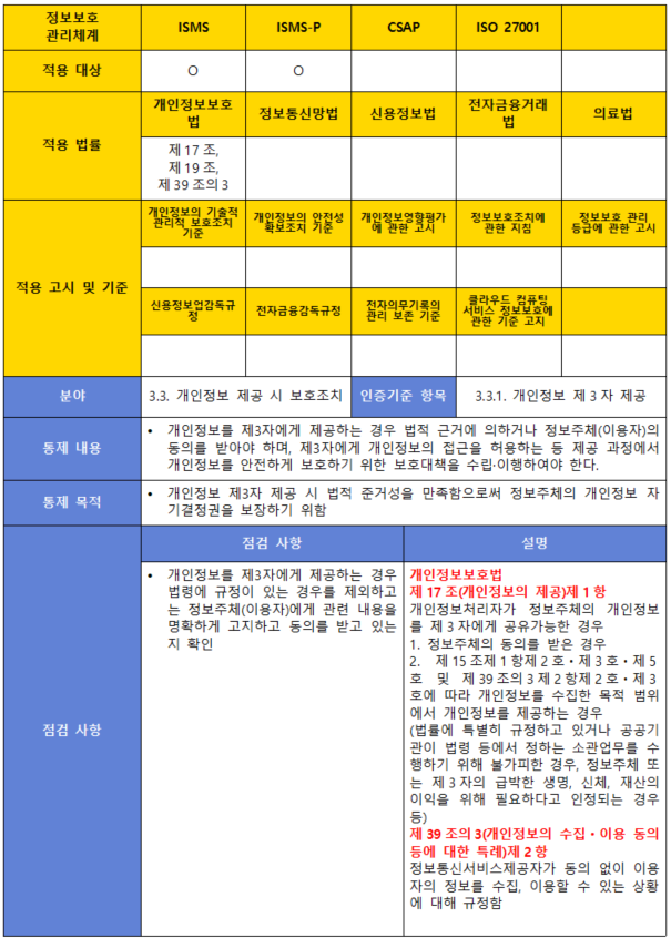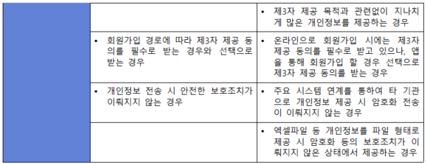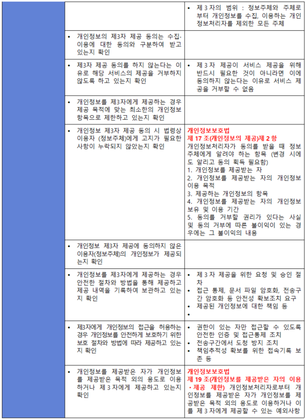 (내용) 개인정보를 제3자에게 제공하는 경우 법적 근거에 의하거나 정보주체(이용자)의 동의를 받아야 하며, 제3자에게 개인정보의 접근을 허용하는 등 제공 과정에서 개인정보를 안전하게 보호하기 위한 보호대책을 수립·이행하여야 한다.