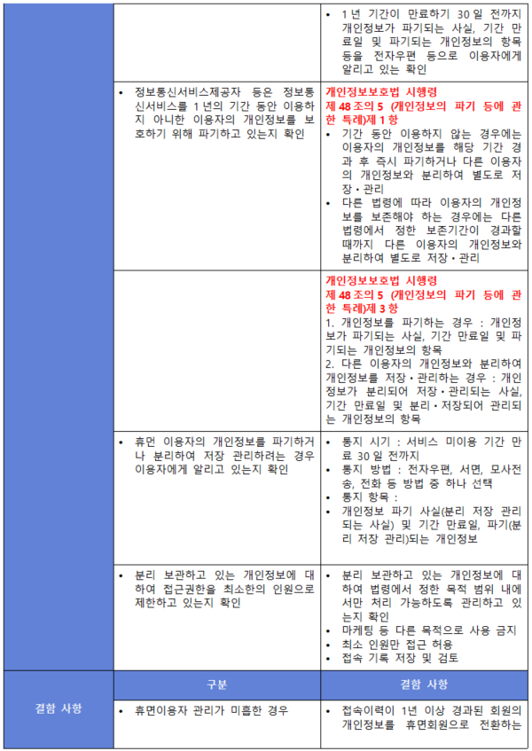 (내용) 서비스를 일정기간 동안 이용하지 않는 휴면 이용자의 개인정보를 보호하기 위하여 관련 사항의 통지, 개인정보의 파기 또는 분리보관 등 적절한 보호조치를 이행하여야 한다.