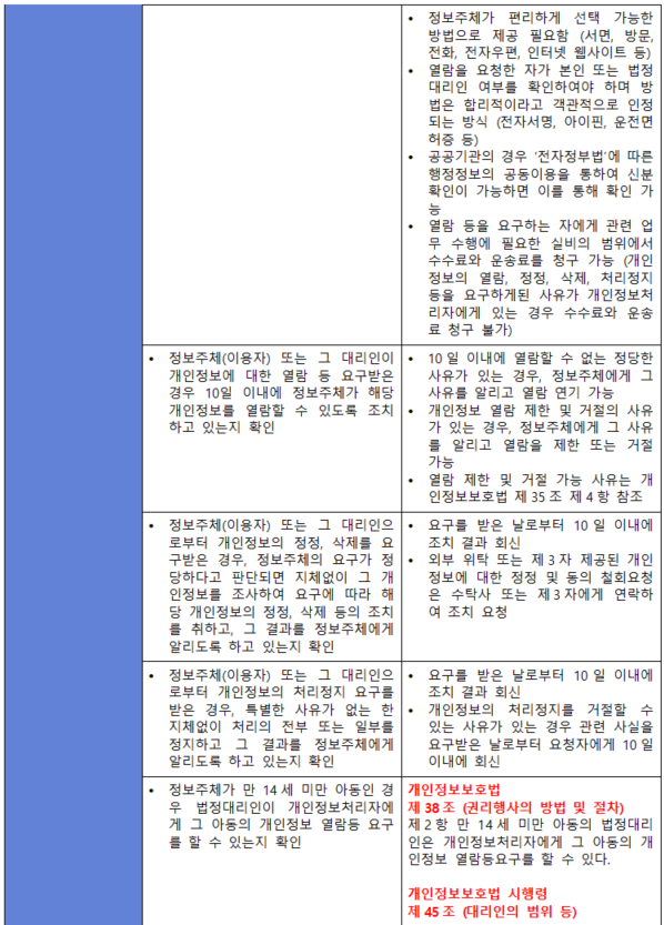 (부제) 나는 CISO 이다/ISMS-P 인증심사 (ISMS-P) 3.5.2 정보주체 권리보장 by 노벰버맨 2021. 12. 10. (항목) 3.5.2 정보주체 권리보장 (내용) 정보주체(이용자)가 개인정보의 열람, 정정·삭제, 처리정지, 이의제기, 동의철회 요구를 수집 방법·절차보다 쉽게 할 수 있도록 권리행사 방법 및 절차를 수립·이행하고, 정보주체(이용자)의 요구를 받은 경우 지체 없이 처리하고 관련 기록을 남겨야 한다. 또한 정보주체(이용자)의 사생활 침해, 명예훼손 등 타인의 권리를 침해하는 정보가 유통되지 않도록 삭제 요청, 임시조치 등의 기준을 수립·이행하여야 한다. 공유하기 게시글 관리 theGAP (SecureDog) 저작자표시 비영리 변경금지 (새창열림) '(부제) 나는 CISO 이다 > ISMS-P 인증심사' 카테고리의 다른 글 (ISMS-P) 정보보호 최고책임자(CISO) 제도 변경 (21년) (0) 2022.01.25 (ISMS-P) 3.5.3 이용내역 통지 (0) 2021.12.10 (ISMS-P) 3.5.1 개인정보처리방침 공개 (0) 2021.12.10 (ISMS-P) 3.4.3. 휴면 이용자 관리 (0) 2021.12.10 (ISMS-P) 3.4.2. 처리목적 달성 후 보유 시 조치 (0) 2021.12.10 관련글 (ISMS-P) 정보보호 최고책임자(CISO) 제도 변경 (21년) (ISMS-P) 3.5.3 이용내역 통지 (ISMS-P) 3.5.1 개인정보처리방침 공개 (ISMS-P) 3.4.3. 휴면 이용자 관리 댓글
