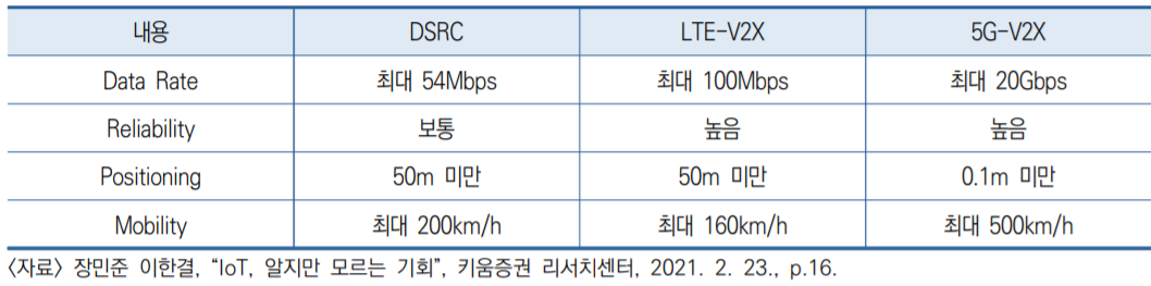 | DSRC | WiFi IEEE 802.11p, 802.11bd 기반 WAVE |