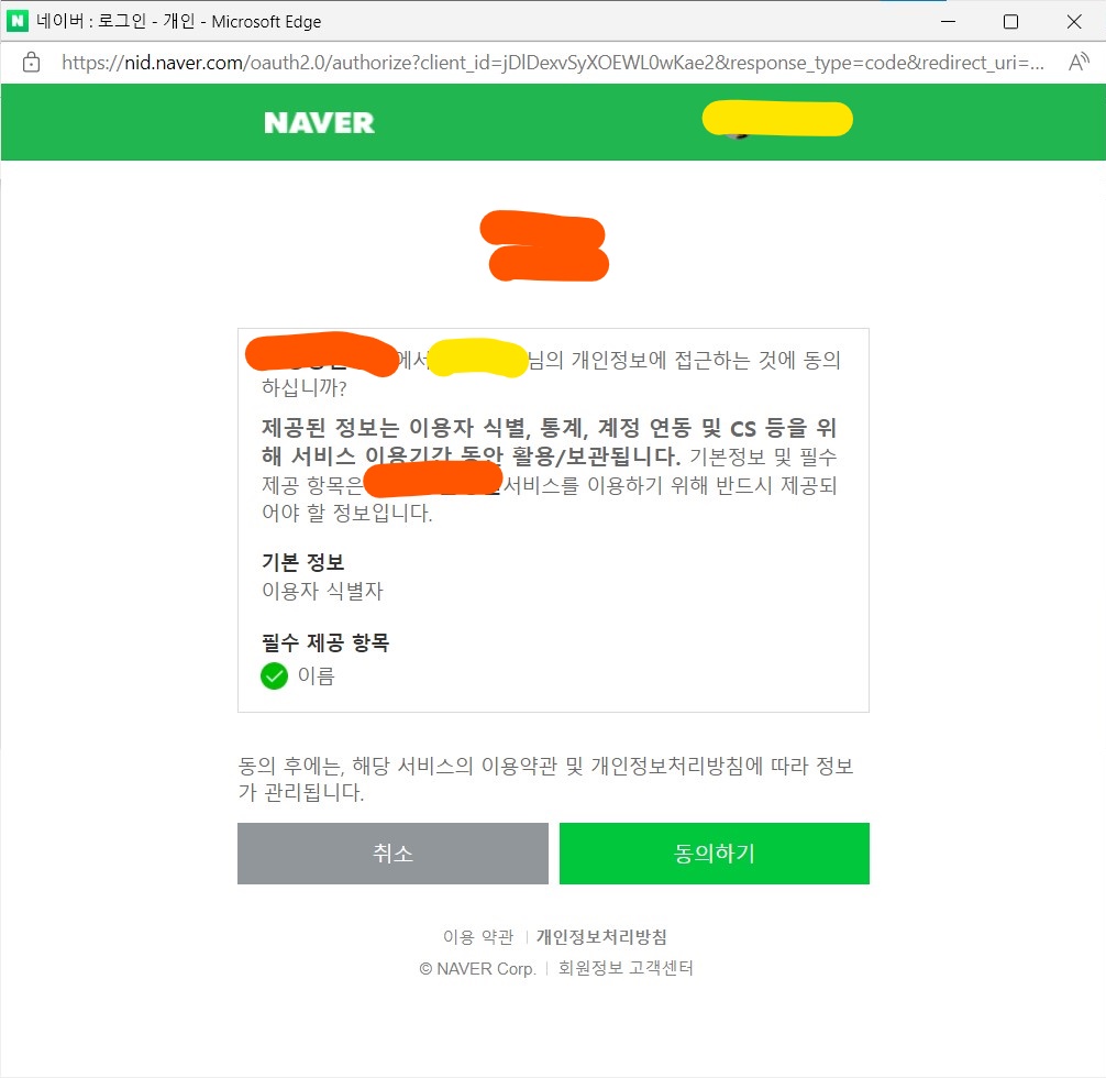 | 네이버 | 이용자 식별자, 이름 |