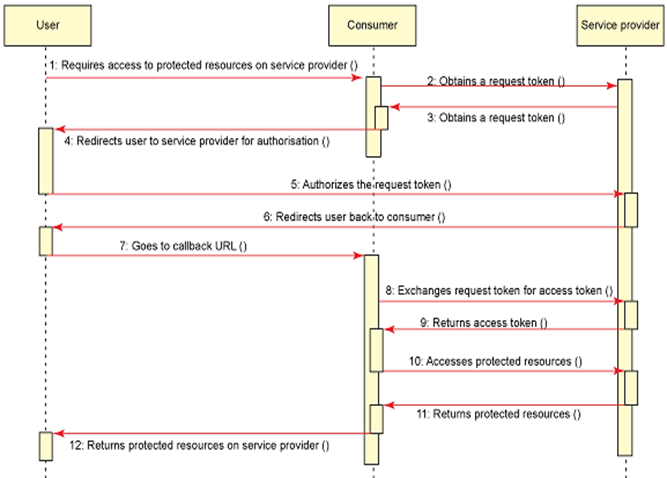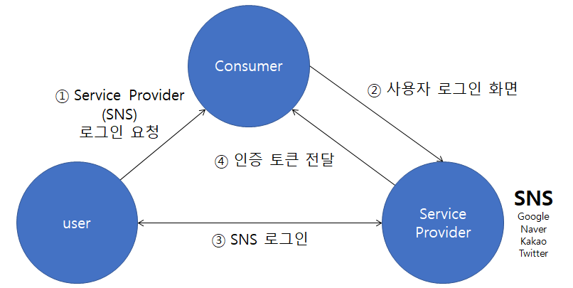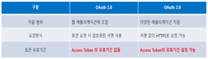 -OAuth 1.0은 유저(user), 컨슈머(consumer), 서비스 프로바이더(service provider)으로 구성되어 있으며 구현이 복잡하고 웹이 아닌 어플리케이션에서의 지원이 부족하거나 인증토큰(access token)이 만료되지 않는 등의 단점 존재