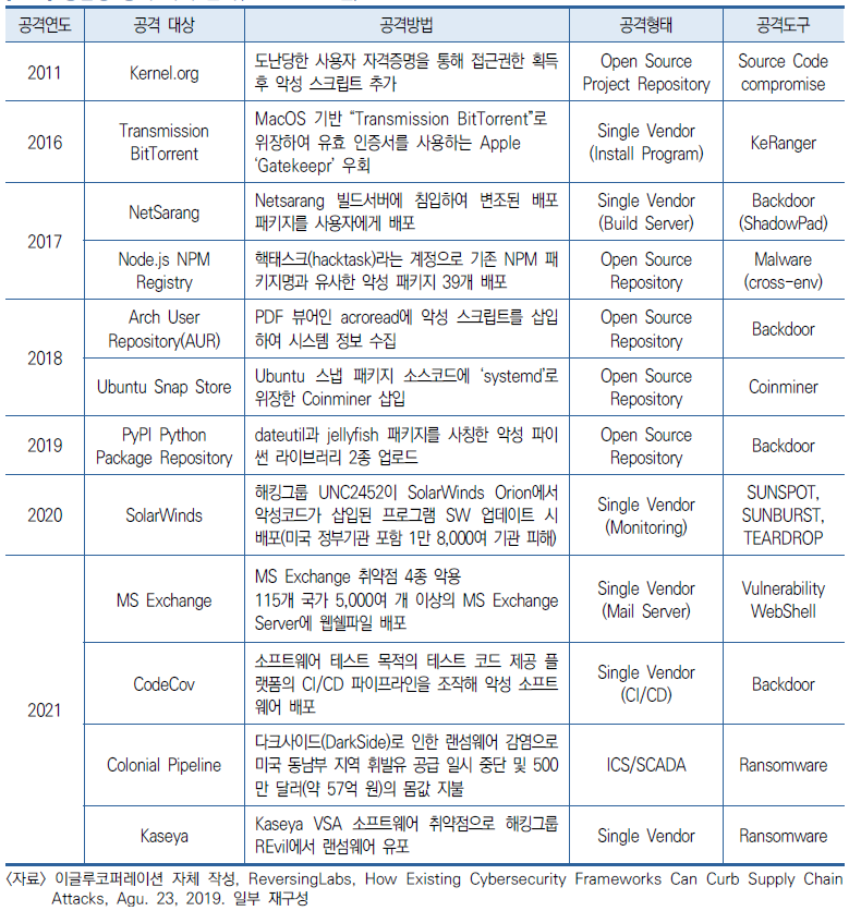 - 2020년 이후 솔라윈즈, 콜리니얼 파이프라인, 카세야, MS Exchange Server 사태 등 공급망 공격 사건 다수 발생