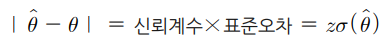 | 정도 | -비편향추정량의 정도(pression) -신뢰계수를 z로 표시하면 추정치와 모수의 관계를 다음과 같이 표현 가능 |