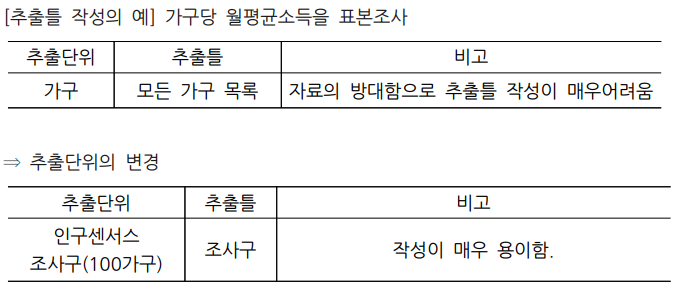 | 추출단위 | -모집단에서 표본을 추출하기 위해 설정한 기본단위들의 집합 -기본단위와 추출단위가 서로 상이할 수 있음 -추출단위를 기본단위와 동일하게 할 것인지에 따라 추출틀 작성이 달라질 수 있음 o 추출단위와 기본단위가 같은 경우 -여론조사에서 개인을 표본으로 선택할 경우, 기본단위와 추출단위가 모두 개인으로 동일 o 추출단위와 기본단위가 다른 경우 -여론조사에서 가구를 표본으로 선택할 경우, 기본단위는 개인, 추출단위는 가구 *추출단위의 조건 -기본단위는 모두 어느 한 추출단위에 포함 -기본단위는 두개이상의 추출단위에 동시 포함 불가 -추눌단위는 조사현장에서 확인 가능, 추출작업이 용이 |