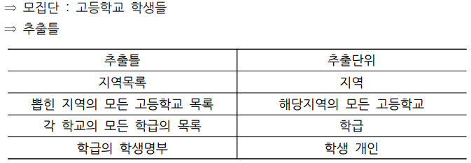 | 추출틀 or 추출대장 | -표본추출단위들로 구성된 목록 -표본조사에서 표본은 실제적으로 추출틀로부터 뽑히기 때문에 추출틀 작성이 필수, 추출단위를 결정할 때부터 미리 추출틀을 작성할 수 있는 추출단위들로 고려 *추출틀의 요건 -정의된 모집단 내의 모든 추출단위들을 포함 -어느 추출단위도 중복 불가 ![]() *추출틀의 종류 -명부틀: 가구나 개인을 추출단위로 하여 목록이나 명부 작성 가능한 경우 -지역추출틀: 시, 면과 같이 일정한 지역을 추출단위로 정의하는 경우 ![]() |