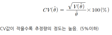 | 변동계수 | -CV(Coefficient of Variation) -추정량의 표준오차가 추정량의 형태에 따라 달라짐으로 이를 해결하기 위한 방법으로 변동계수를 이용함 ![]() |