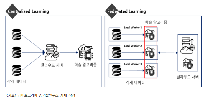 | 중앙 컴퓨팅 | 통신 지연, 보안 문제 극복 | 중앙에서 학습 결과 취합, 더 정교한 모델 생성 및 재배포 |