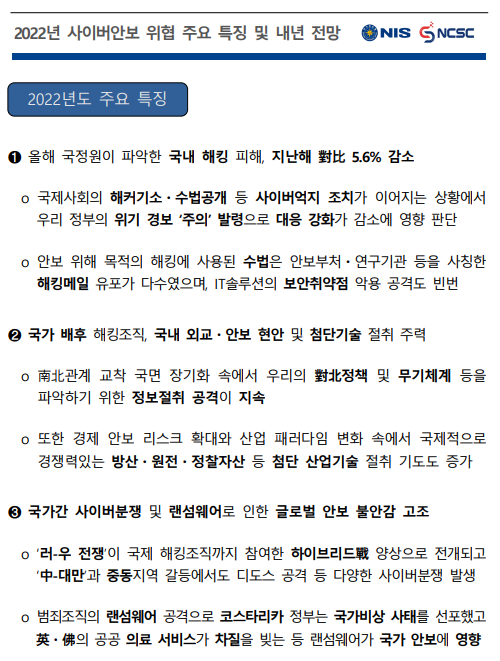 -대북관련 정책 및 무기체계 등 관련 정보 절취 공격 지속
