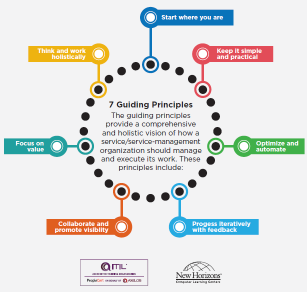 | Think and work holistically | 전체적 사고/작업 | -knowing the overall picture of the service and service management (a bird's eye view) : servcies, processes, practices, functions, partner and supplier organization -All the activities of the systems must be connected and visualized holistically. |