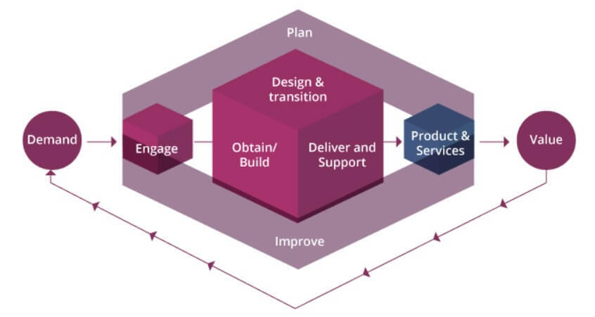 | Obtain & Build | Product/Service 구축, 성능 통합, 테스트 및 확인 | -ensure that all service components are available when and where needed, and that they meet the agree specifications -requirement are transformed into service component (Design & Transition, Deliver & Support) |