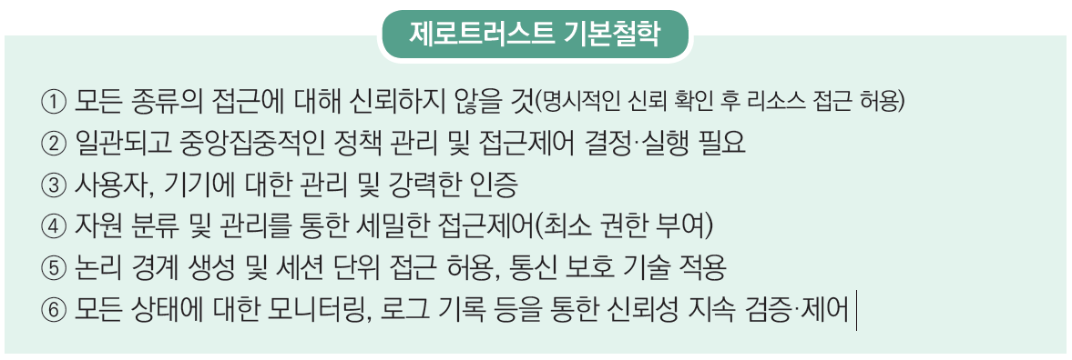-정보 시스템 및 서비스에 대한 접속요구가 있을 때 네트워크가 이미 침해된 것으로 간주하고, 주어진 권한을 정확하고 최소한으로 부여하는데 있어서 불확실성을 최소화하도록 설계된 개념 및 아이디어 모음(NIST SP 800-207, ’20년)