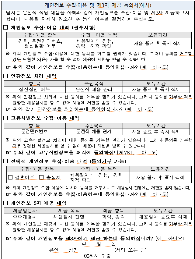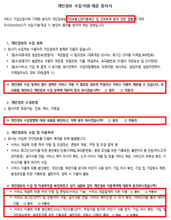 또한 수집항목, 수집방법, 이용목적 등을 각각 동의받는 경우가 있는데 이럴 경우 정보주체가 수집항목에는 동의를 하였으나 수집방법은 미동의를 했을 경우 개인정보를 수집할 수 없게 되므로 동의서를 받을 의미가 없어지게 됩니다.