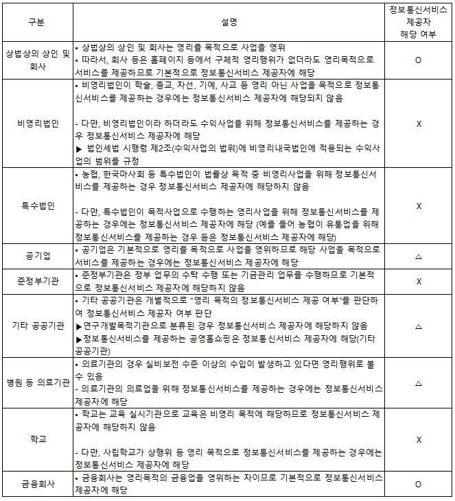 -(영리목적 유무), 법인의 특성, 정보통신서비스의 성격, 목적 등을 바탕으로 종합적으로 고려