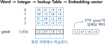 -이때의 밀집 벡터를 워드 임베딩 과정을 통해 나온 결과하며 임베딩 벡터(embedding vector)라고도 함